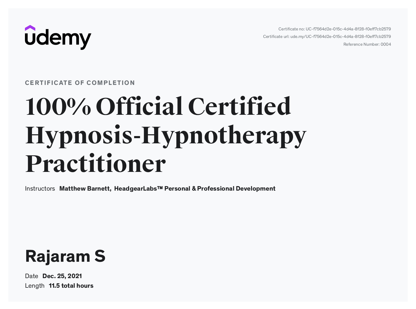 100% Official Certified Hypnosis-Hypnotherapy Practitioner