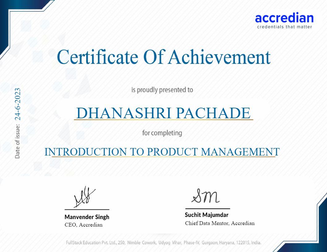 2023 - 2024Post Graduate Program in Product Management A+veActivities and Societies: Product Management, Product Strategy and Road Map, Product Design Thinking, UI / UX for Product Managers, Product Engineering, Product Marketing and Launch, Analytics for Product Management, Data Analytics with Python Product Management, Product Strategy and Road Map, Product Design Thinking, UI / UX for Product Managers, Product Engineering, Product Marketing and Launch, Analytics for Product Management, Data Analytics with Python - From - Accredian - INSAID - The International School of AI and Data Science.