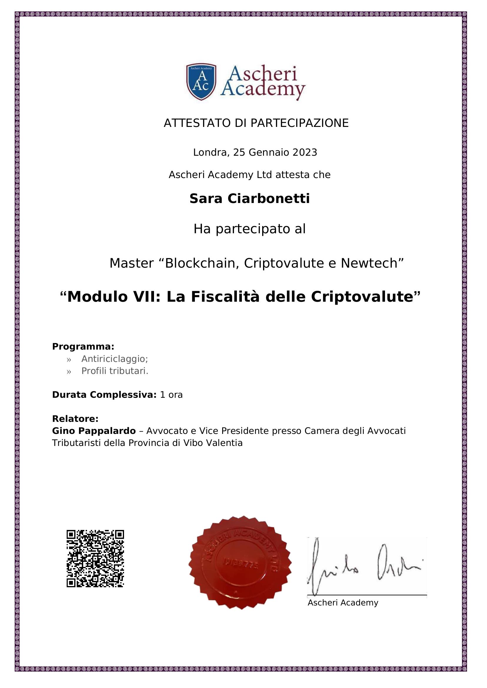 Ha partecipato al Master “Blockchain, Criptovalute e Newtech” “Modulo VII: La Fiscalità delle Criptovalute”