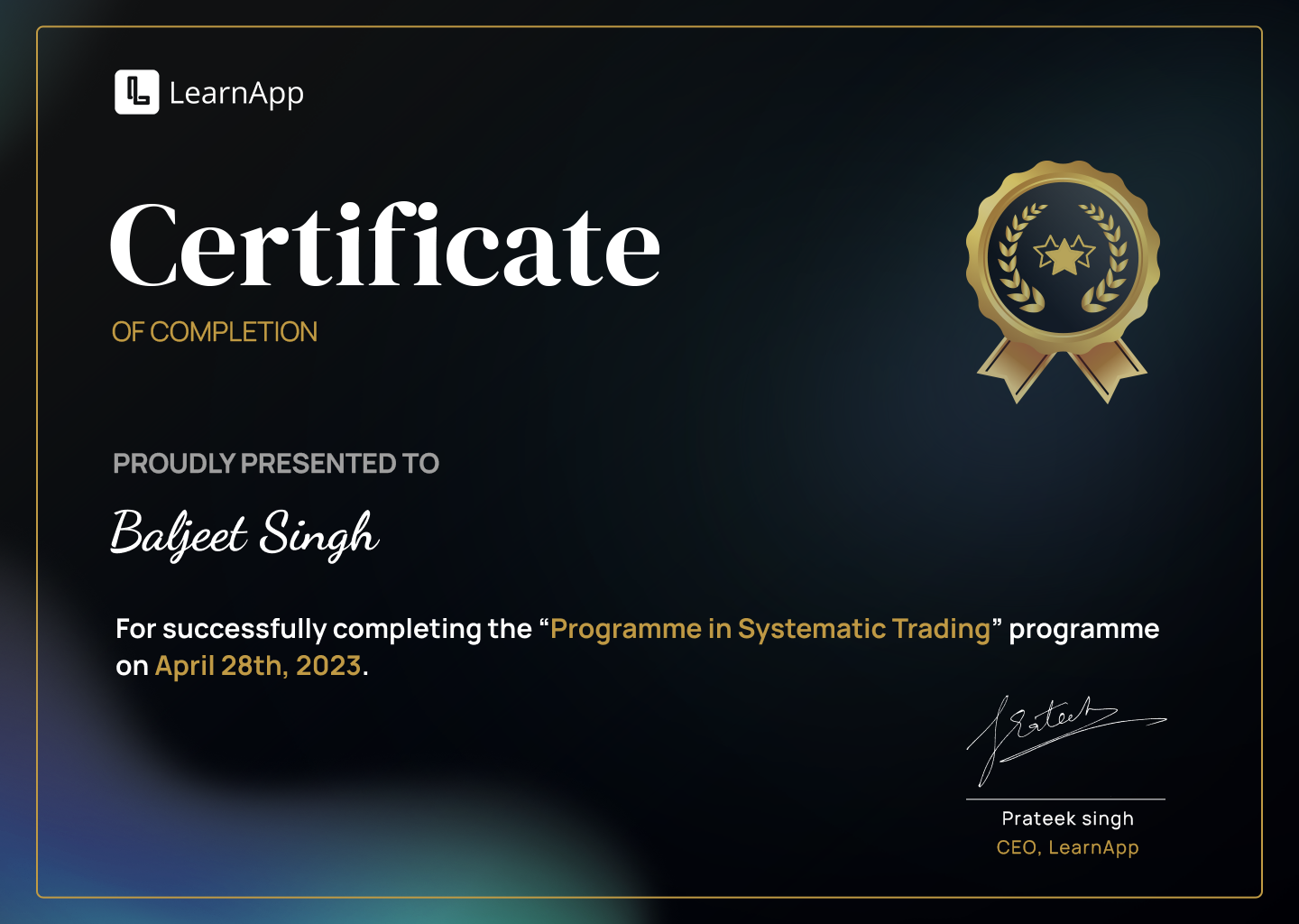 - Awarded to Baljeet SinghGold Medalist Diploma CSE (2008-2011) PSBTE 2012 Gold Medalist Diploma CSE (2008-2011)