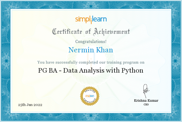 -Post Graduate Program in Business AnalysisOnline Post Graduation Program from Purdue University (offered by Simplilearn Platform) endorsed by International Institute of Business Analysis (IIBA)Courses Cover in the Program:1. CBAP Certification2. Business Analytics with Excel 3. Tableau Training 4. SQL5. Data analysis with Python6. Data Visualization with Python7. Mathematical optimization for business problem8. BA Capstone Project