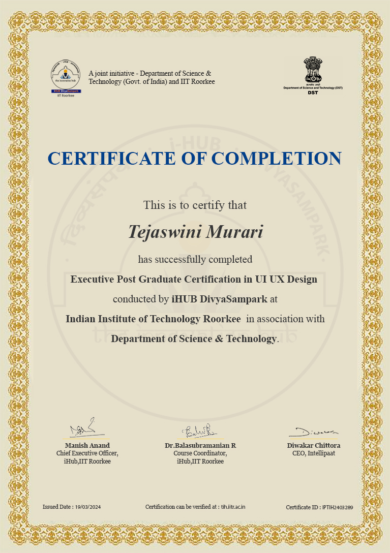 2023 - 2024Executive Post graduation Certification in UI UX Design Design and Visual Communications, GeneralAs a passionate individual aspiring to transition into the field of UI/UX design and advance my career in this dynamic domain, I am currently enrolled in the Executive PG Certification in UX UI Designing. This program, conducted in collaboration with IIT faculty and industry experts, provides me with valuable guidance and a comprehensive training experience.The institute's collaboration with IIT faculty and industry experts is a testament to its commitment to providing a high-quality education… Show more As a passionate individual aspiring to transition into the field of UI/UX design and advance my career in this dynamic domain, I am currently enrolled in the Executive PG Certification in UX UI Designing. This program, conducted in collaboration with IIT faculty and industry experts, provides me with valuable guidance and a comprehensive training experience.The institute's collaboration with IIT faculty and industry experts is a testament to its commitment to providing a high-quality education that is relevant and up-to-date.Recognizing my ambition to make a successful career transition, I chose this institute specifically for its focus on practical, industry-oriented training that aligns with my career goals. Show less