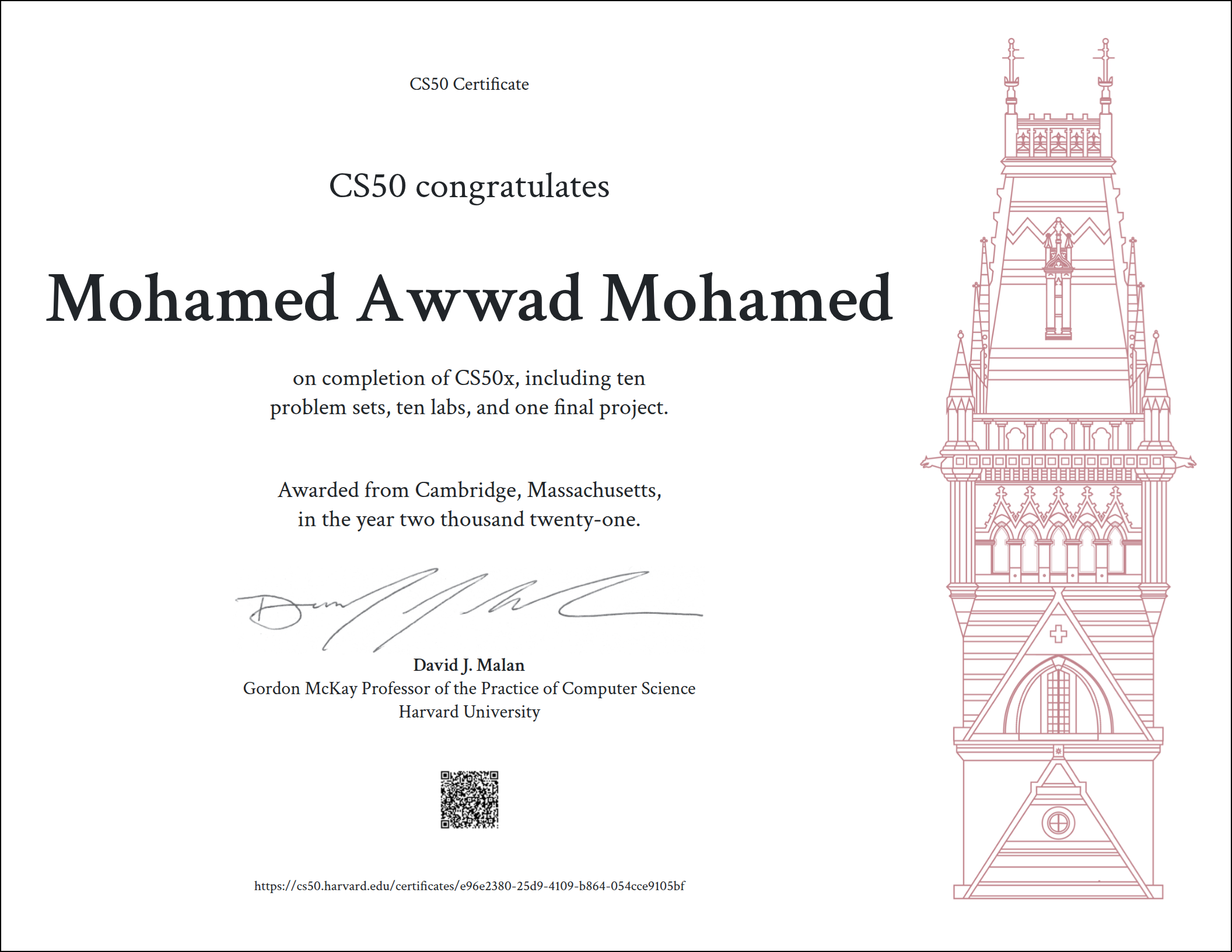 2021 - 2021CS50x Computer Science CS50xActivities and Societies: Attending Labs, Problem Solving, Simply this course is an introduction to the intellectual enterprises of computer science and the art of programming. This course teaches students how to think algorithmically and solve problems efficiently. Topics include abstraction, algorithms, data structures, encapsulation, resource management, security, software engineering, and web programming. Languages include C, Python, and SQL plus HTML, CSS, and JavaScript. Problem sets are inspired by the arts, humanities, social sciences, andโฆ Show more Simply this course is an introduction to the intellectual enterprises of computer science and the art of programming. This course teaches students how to think algorithmically and solve problems efficiently. Topics include abstraction, algorithms, data structures, encapsulation, resource management, security, software engineering, and web programming. Languages include C, Python, and SQL plus HTML, CSS, and JavaScript. Problem sets are inspired by the arts, humanities, social sciences, and sciences. The course culminates in a final project. Designed for concentrators and non-concentrators alike, with or without prior programming experience. Two-thirds of CS50 students have never taken CS before. Among the overarching goals of this course are to inspire students to explore unfamiliar waters, without fear of failure, create an intensive, shared experience, accessible to all students, and build community among students. Show less