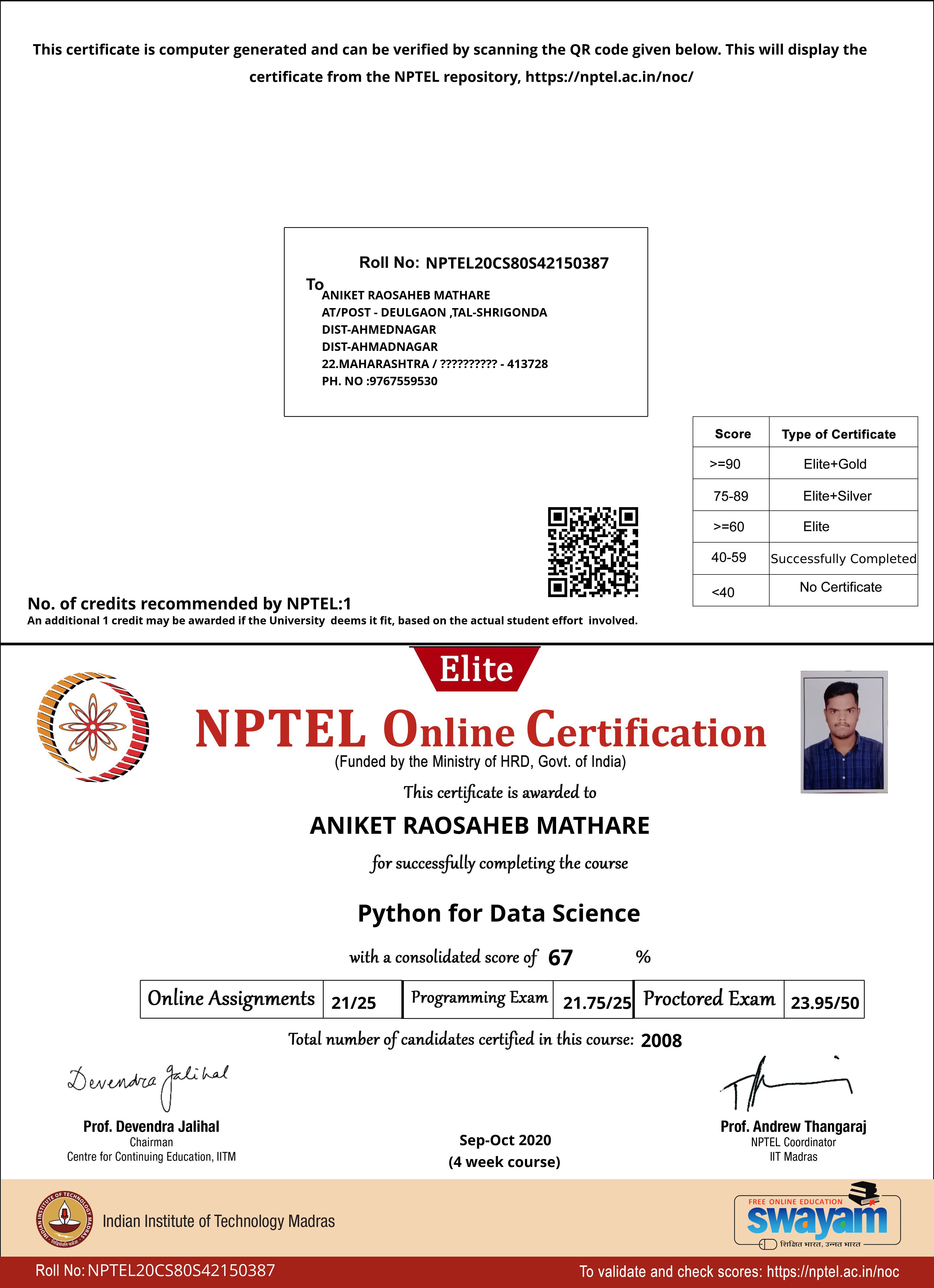 Indian institute of technology, madrasOct 2020 - View certificate