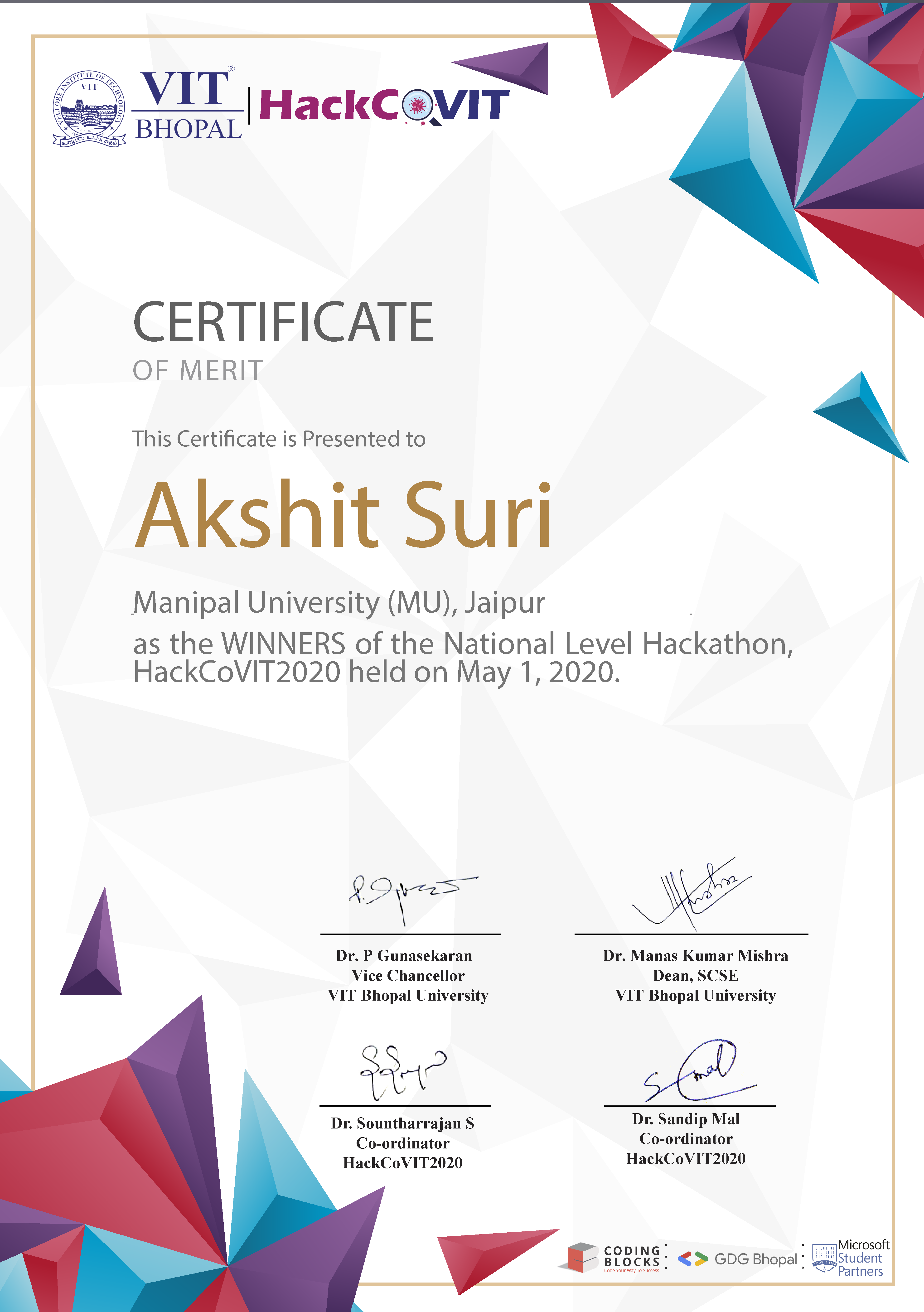 - Awarded to Akshit SuriWinner of HackCoVIT 2020 VIT Bhopal May 2020 Adjudged winner of HackCoVIT 2020 amongst 70+ participating teams.